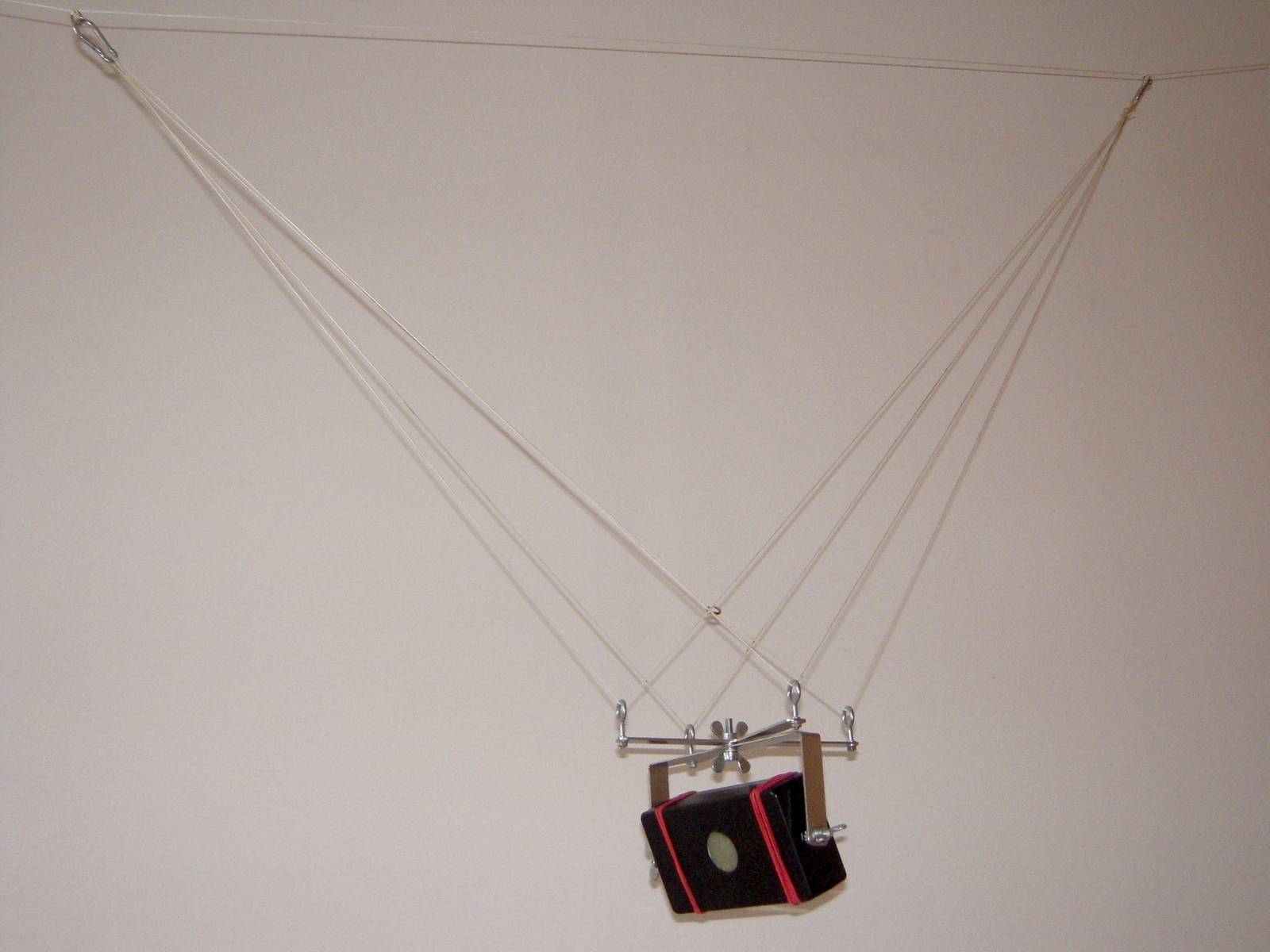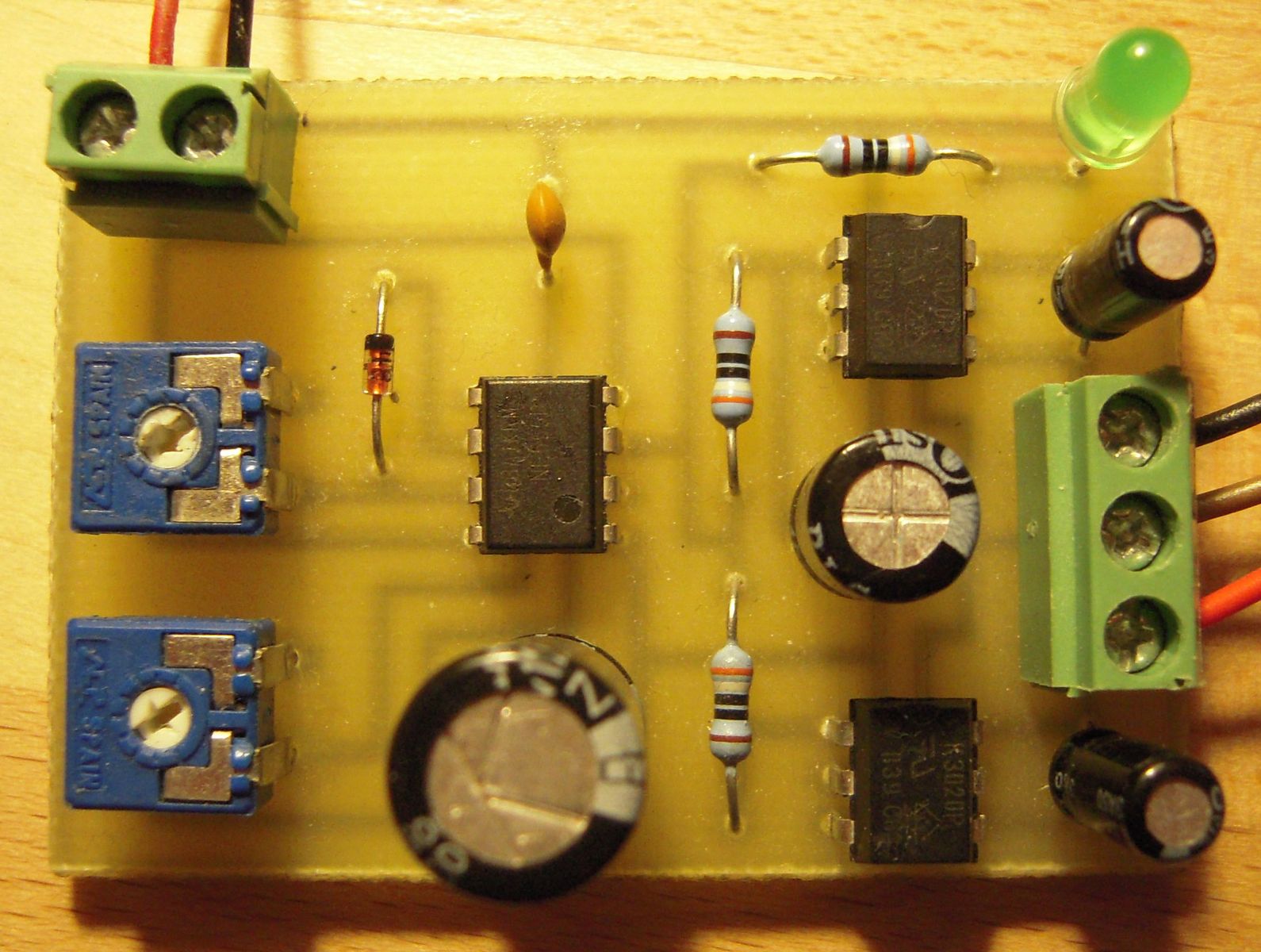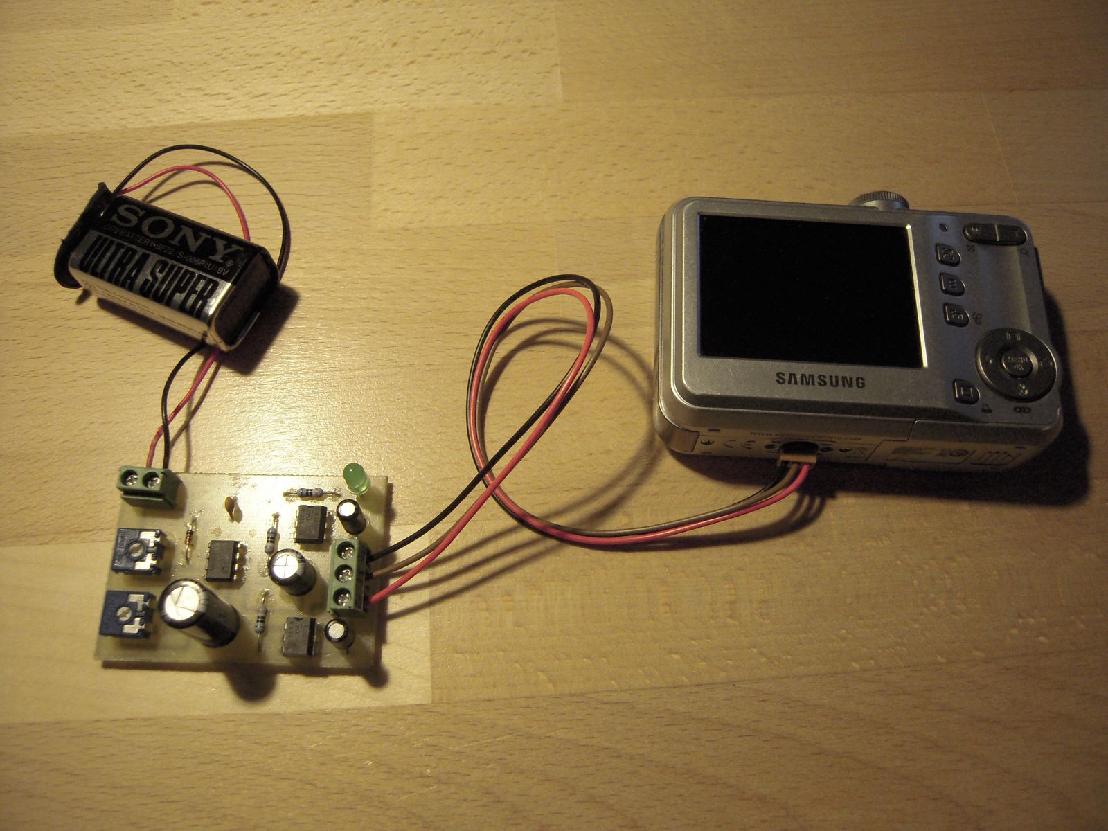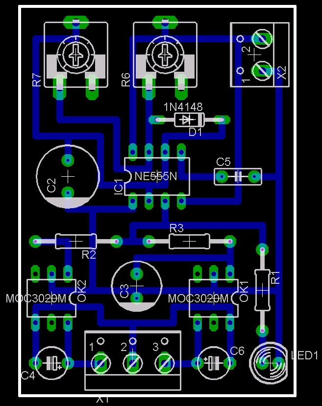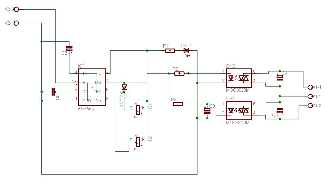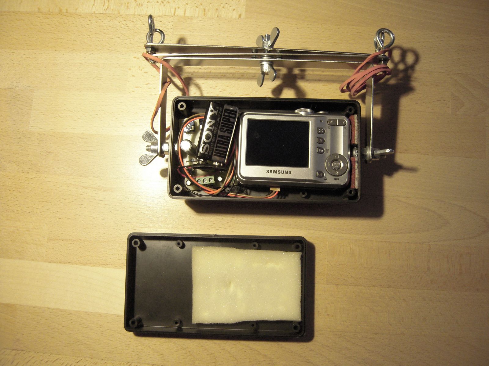 sestrojit KAP soupravu II. Ale vrame se k jednièce. Jedná se o Picavetùv køí, který velice spolehlivì stabilizuje fotoaparát vùèi otáèení a naklánìní zpùsobeném rùzným úhlem šòùry draka vùèi zemi. Je vyrobený z nerezového plechu. Šòùra je provleèena závìsnýmy oèky. Lepší by byly miniaturní kladièky. Jene nejsem schopen takové nikde najít. Kdybyste náhodou o nìèem vìdìli, dostupného tady u nás, dejte mi prosím vìdìt. Foák jsem pouil Samsung S760 z bazaru v Hodonínì za 500,-. Nejdøív jsem musel foák upravit. Vyvést kontakty tlaèítka spouštì na konektor pro externí ovládání. Konektor je 3 pinový - 1. ostøení 2. spouš 3. kostra. Jediné místo, kam se vejde konektor je závit pro stativ. Závit jsem odstranil a do vzniklého místa vlepil Loctitem konektor. Pájení drátkù k tlaèítku spouštì. Pistolovou trafopájkou se to pájí pìknì blbì. Ale funguje to. Drátky na fotce vypadají strašnì hamatnì, ale prùøez mají jen 0,05mm2. Èasový spínaè je klasická 555. Dvojicí trimrù lze nastavit frekvenci spínání 0 a 50sec a dobu sepnutí 0-5sec. Zpodìní sepnutí spouštì po ostøení je øešeno kondenzátorem C3 s velkou kapacitou. Pro spínaní vlastních kontaktù tlaèítka spouštì je pouita dvojice optotriakù. Schéma a DPS jsem dìlal v Eaglu. Samozøejmì si je mùete stáhnout Takto